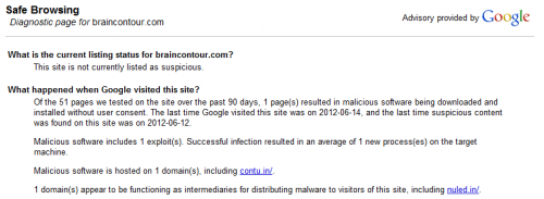 https://www.braincontour.com contains content from nuled.in, a site known to distribute malware. Your computer might catch a virus if you visit this site.
