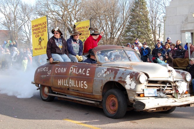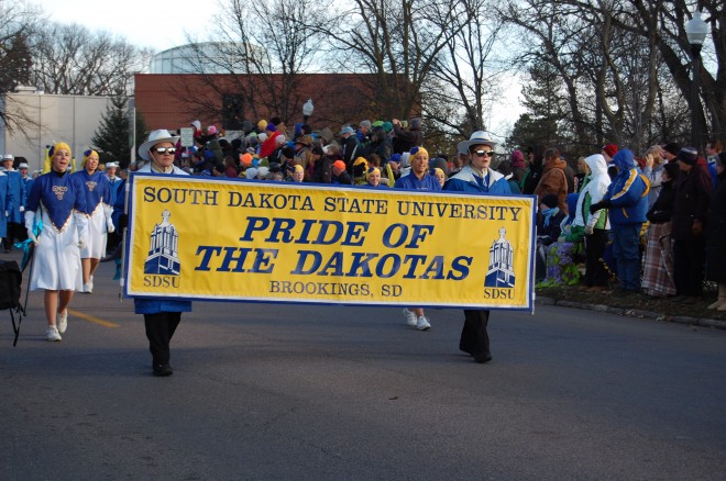 Residents and vacationists gathered along avenues and side streets in a 23F cold Saturday morning in Brookings, South Dakota to witness the 2012 Hobo Day parade. The event was part of the week-long celebration commemorating 100 years of Hobos.