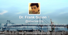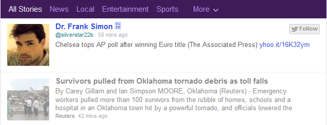 Yahoo posted a tweet update from a user named Dr. Frank Simon (@silverstar22b). Dr. Frank Simon has over 200,000 tweets, mostly links to news from other websites.