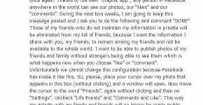 Hello to all of you who are on my list of contacts of Facebook. I would like to ask a favour of you… You may not know that Facebook has changed its privacy configuration once again. Thanks to the new “Graphic app”, any person in Facebook anywhere in the world can see our photos, our “likes” and our “comments”. During the next two weeks, I am going to keep this message posted and I ask you to do the following and comment “DONE”. Those of my friends who do not maintain my information in private will be eliminated from my list of friends, because I want the information I share with you, my friends, to remain among my friends and not be available to the whole world. I want to be able to publish photos of my friends and family without strangers being able to see them which is what happens now when you choose “like” or “comment”.