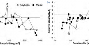 We found the Moment Distance Index (MDI) to perform as well as or better than optimized band ratio models in terms of bias and RMSE. The 720-730 nm PWR for chlorophyll and 450-500 nm PWR for carotenoids are not only sensitive to pigment concentrations, but could distinguish maize spectra from soybean spectra.