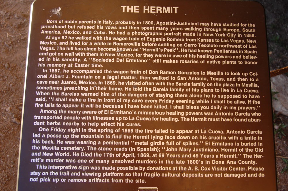 The cave also shares the story of “The Hermit.” He lived in the 19th century and was murdered by unknown assailants. The story of the elderly Hermit of La Cueva has now become part of the great historical richness of New Mexico. Read his story below.