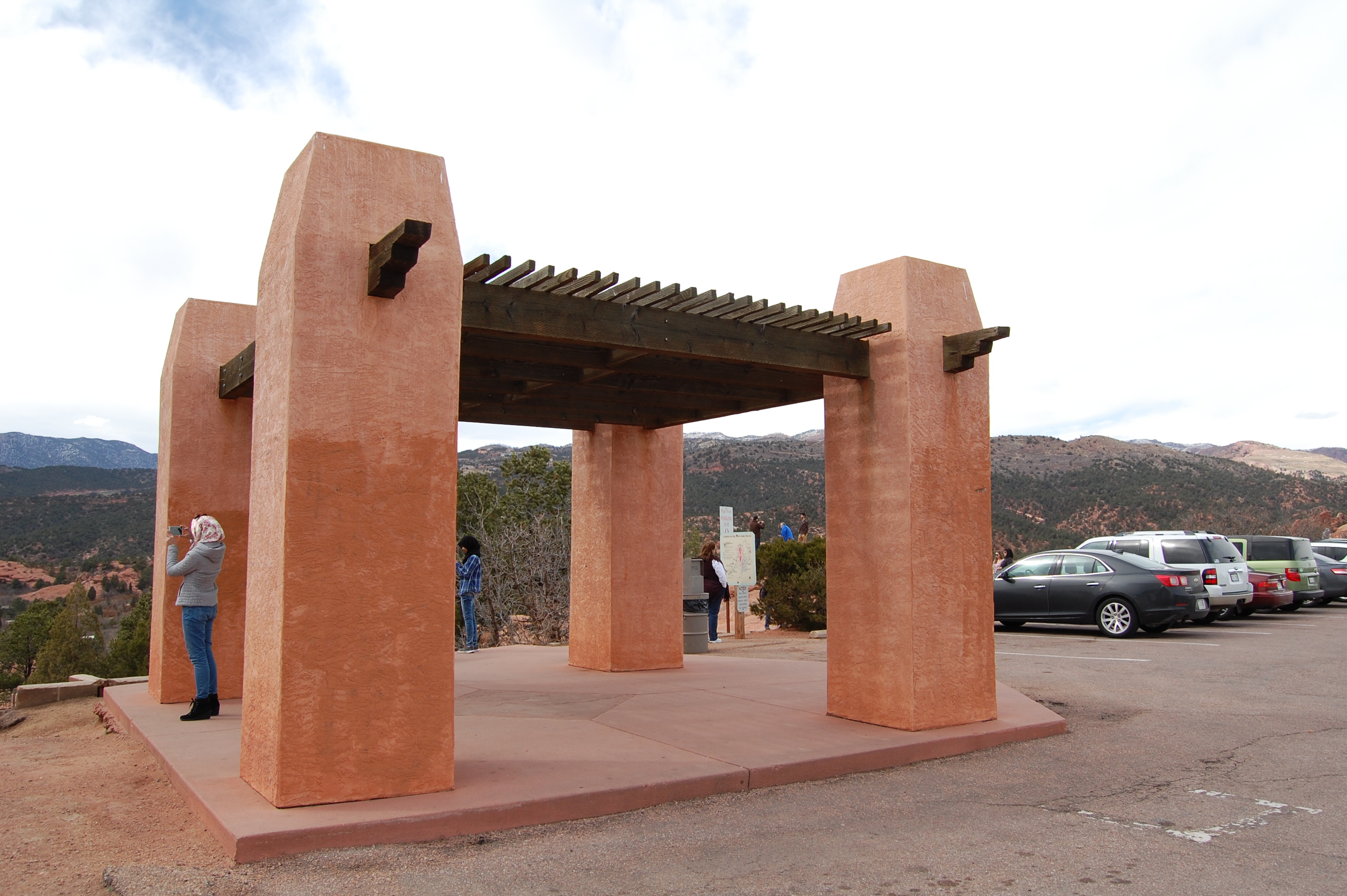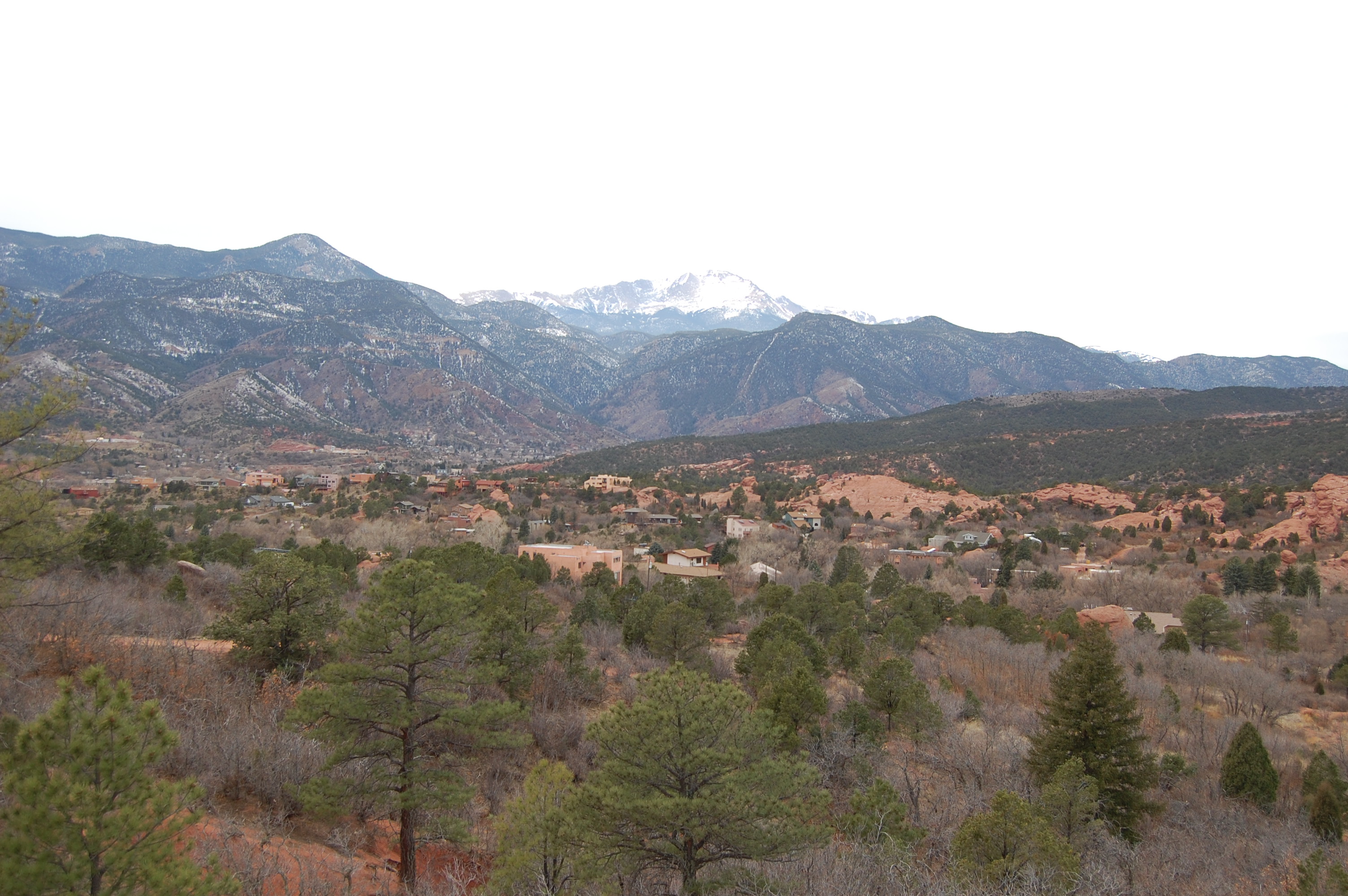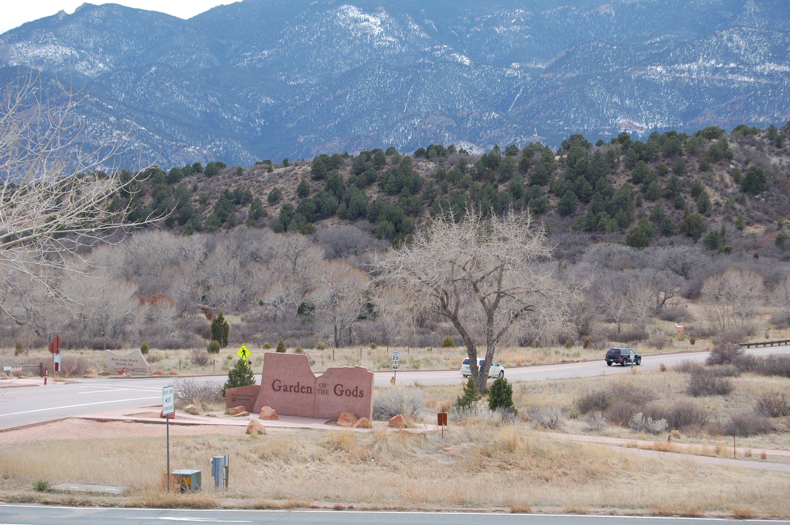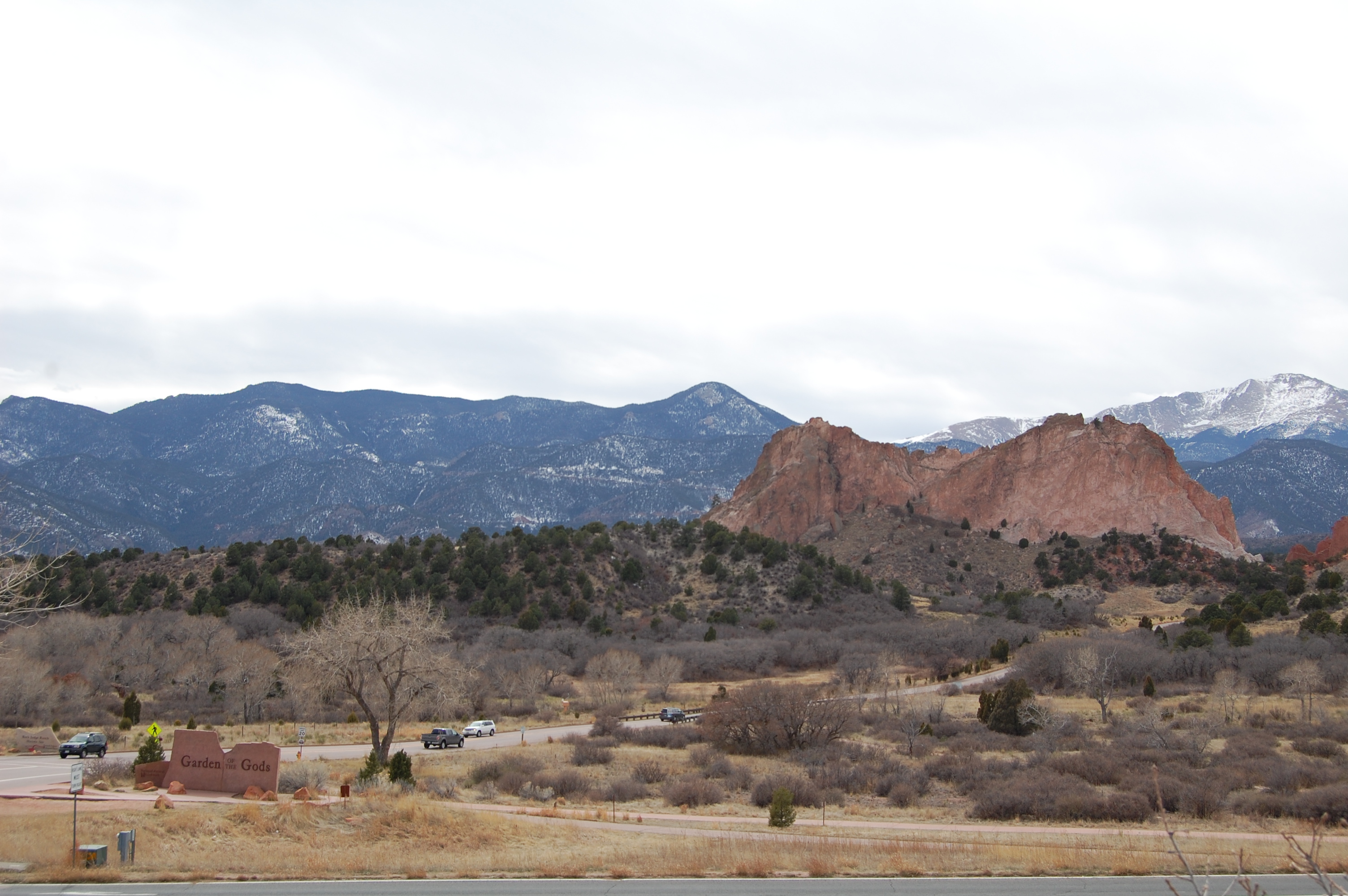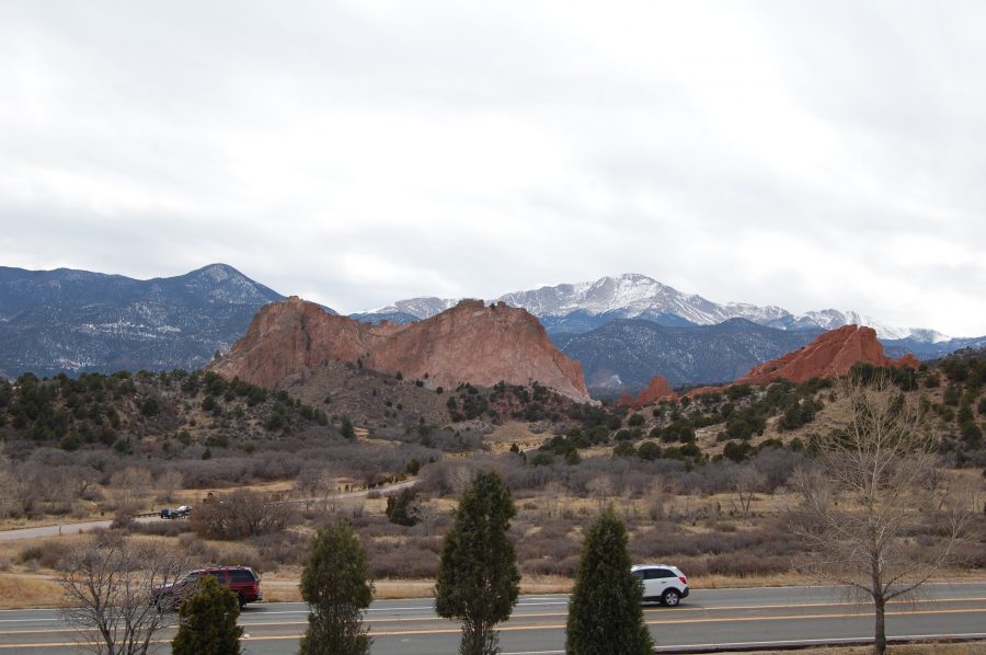 The Visitor Center is atop a hill and from its parking lot you can see the Garden of the Gods at a distant with the snow-capped mountains in the backdrop.