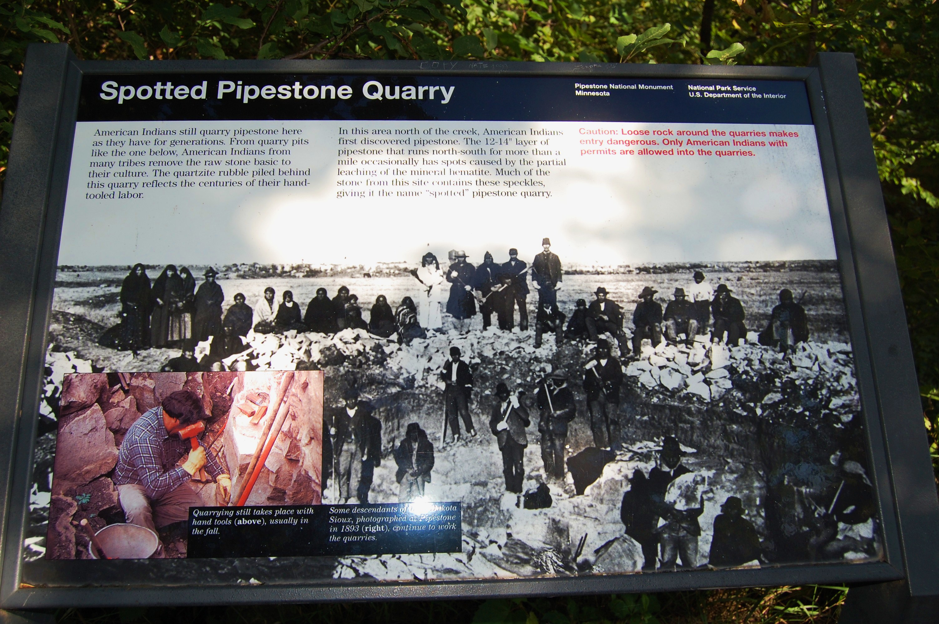 The place is peaceful. There you will find a quarry of red catlinite stone hidden under a layer of Quartzite. The catlinite, aka “pipestone”, has been used to make ceremonial pipes for traditional Plains Indian religious practices. Only Native American ancestry are allowed to quarry the pipestone. It was designated as a National Monument in 1937.