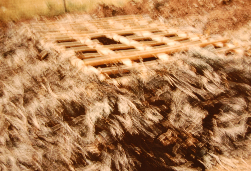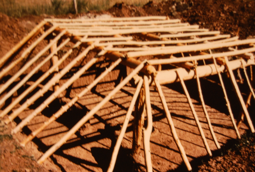 4. Poles are then placed between the roof edge and ground surface above the newly dug pit. Additional poles fill spaces across the top.