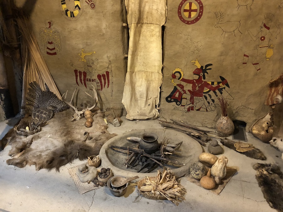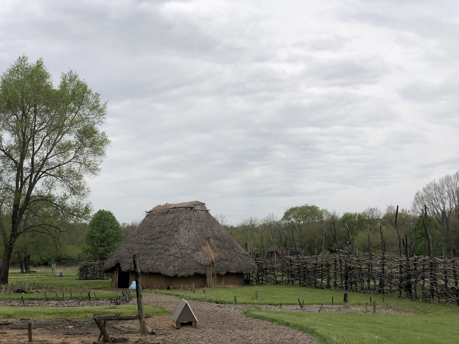 Around 700 years ago, there was a prehistoric Native American village on this spot! It has a large plaza at the center that measures about 200 feet in diameter. The villagers kept the plaza clean and clear of obstructions. The social and ceremonial life of the village, like rituals and games, were played in this space.