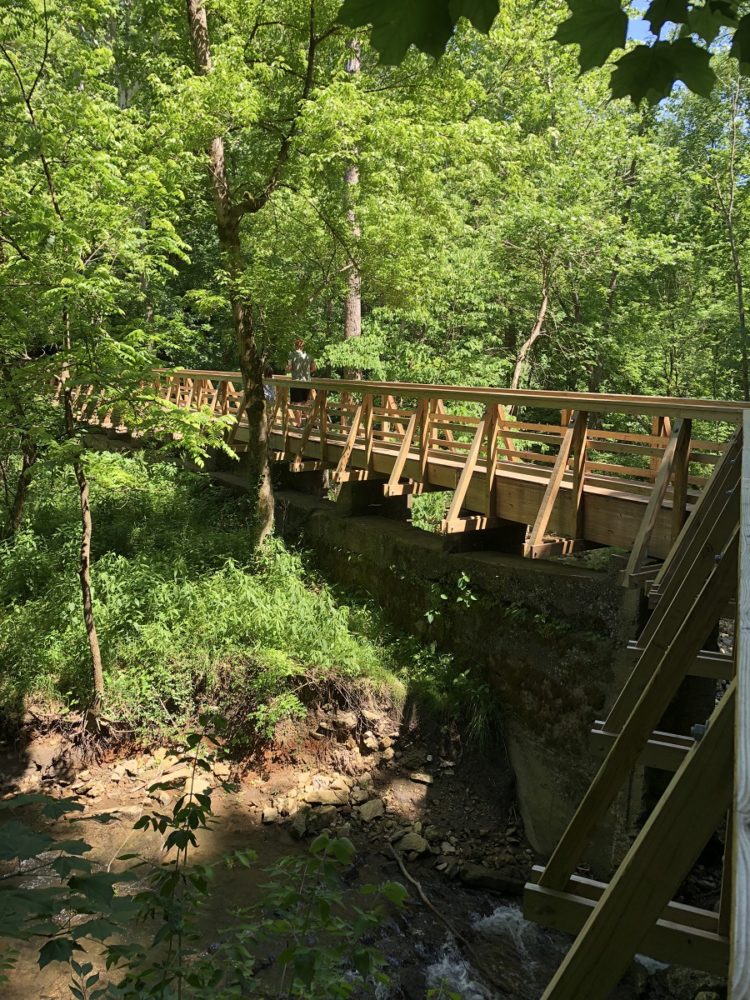 This Cascades waterfall on Birch Creek was formed because the Cedarville dolomite rock that forms the top layer is harder than the Springfield dolomite below it. The stone bridge upstream from the Cascades is part of an old stagecoach route.