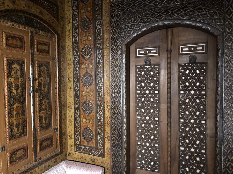 Syrian craftsmen created a room with walnut paneled walls that frame a series of elaborate painted doorways, cupboards and shuttered windows. The decoration is typical of the Ottoman decorative style, featuring flowering vases and pedestal bowls full of fruits, highlighted against a gilt pattern of stylized leaves and blossoms. These motifs show the influence of Ottoman textile and ceramic designs infused with elements of European baroque art.