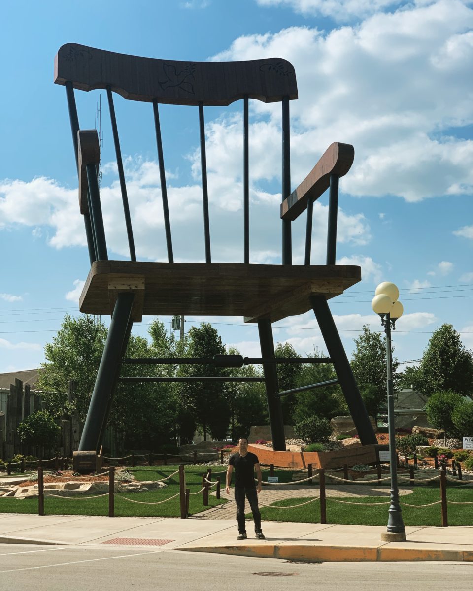 The largest chair and the largest rocking chair in the world is 17.09 m (56 ft 1 in) tall and 9.99 m (32 ft 10 in) wide. The chair was built by American Jim Bolin and located in Casey, Illinois, USA.