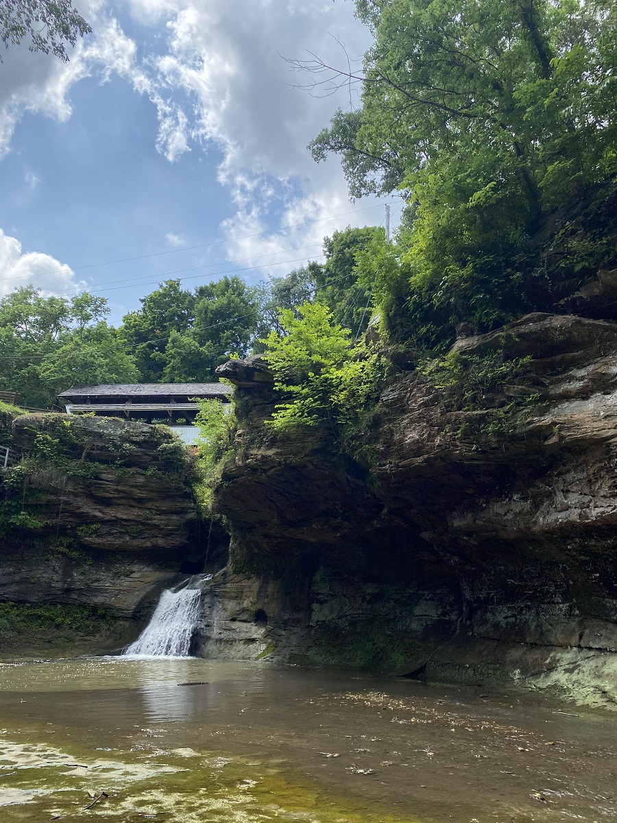 When visiting the Rock Mill Covered Bridge, follow the trail that leads to the waterfall just below the bridge.