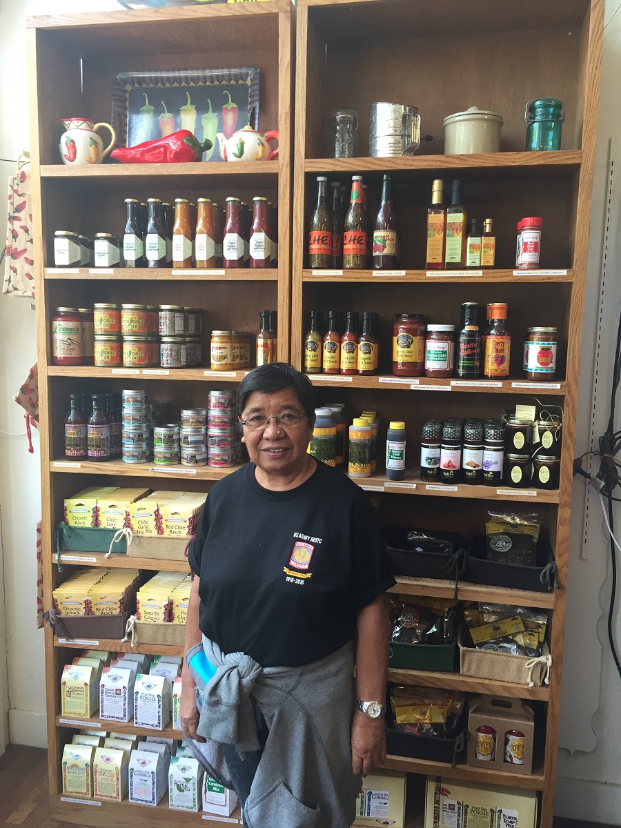 Original hand-hewn vigas, supporting a low, irregular ceiling, join with the old brickwork in creating a fitting background for gift items displayed.