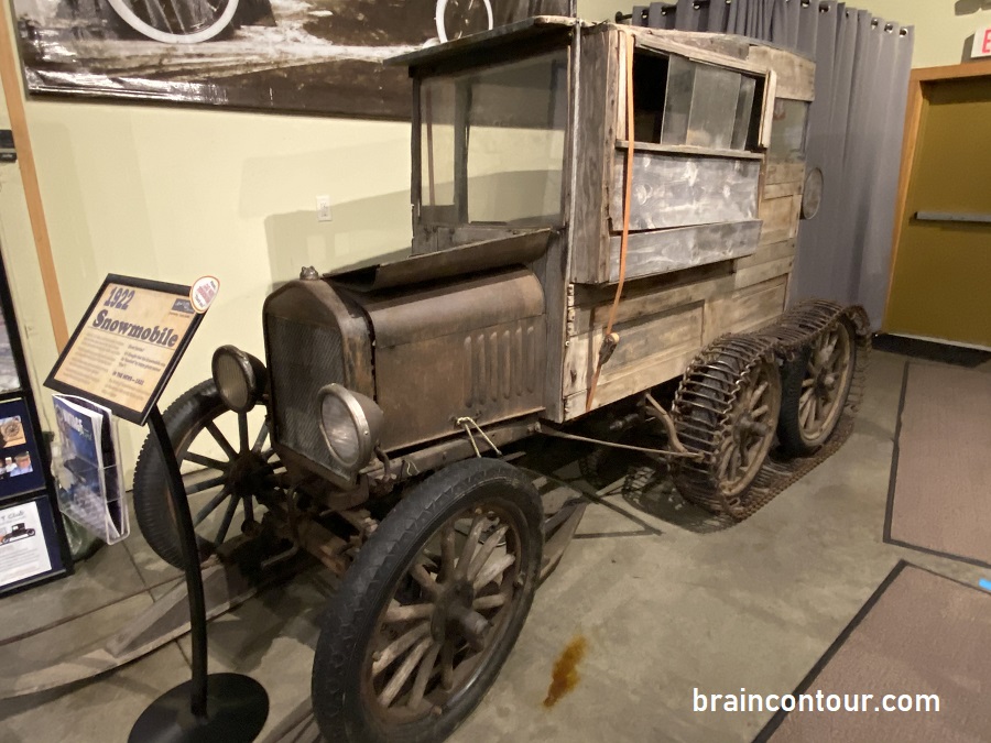This was used by L.O. Gray, rural mail carrier, to deliver mail 60 miles every day in the area of Sauk Centre, Minnesota during the 1920s and 1930s. The body is homemade and constructed primarily from the remains of Hoosier cabinets. It has both tires and skis instead of having to remove the tires to put the skis on.