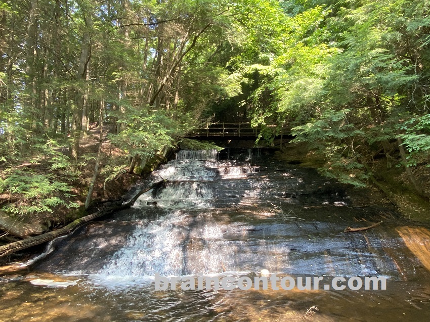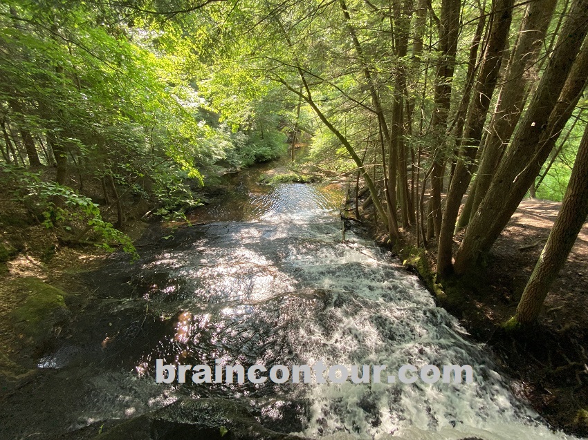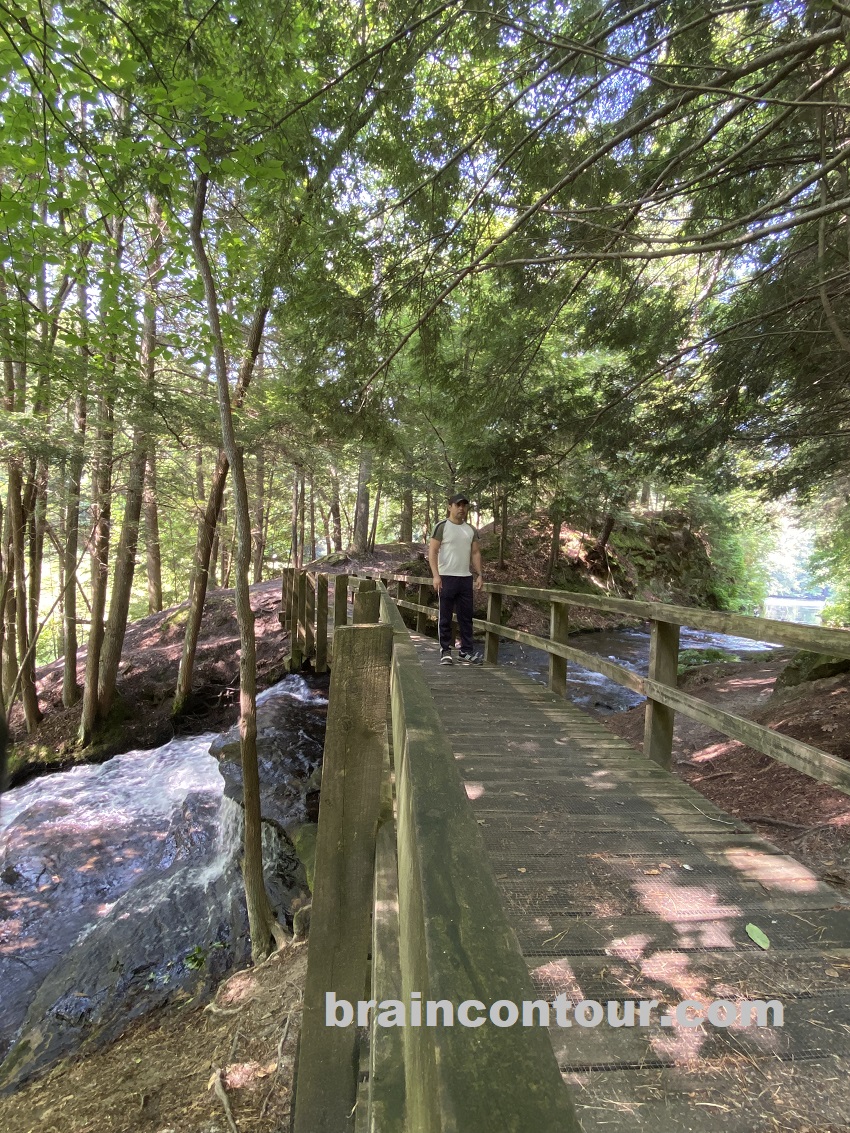 I walked towards the woods and saw a wooded bridge and the waterfall that run beneath it.