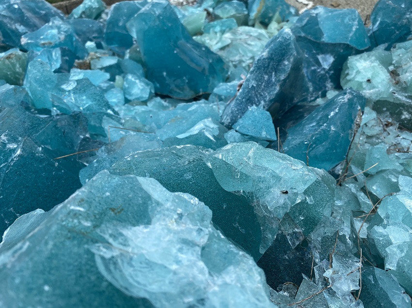 Flowing down one of the hillsides near the Schnormeier Events Center and Tree of Life Labyrinth, it is fashioned with chunks of glass, called “cullet”, and crushed glass.