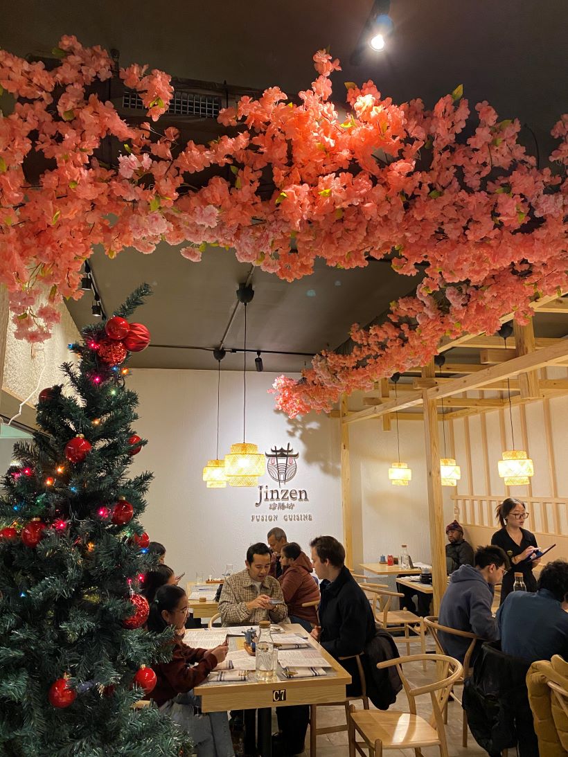 Regarding interior design, Jinzen Fusion Cuisine mirrors its commitment to authenticity. There’s the fabric that gracefully hangs from the ceiling, creating an enchanting atmosphere. The wooden beams are complemented by vibrant cherry blossom decors that add a touch of natural-look beauty to the interior.