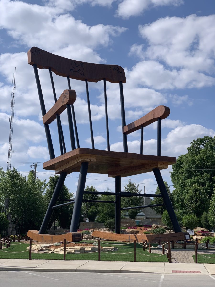 The largest chair and the largest rocking chair in the world is 17.09 m (56 ft 1 in) tall and 9.99 m (32 ft 10 in) wide. The chair was built by American Jim Bolin and located in Casey, Illinois, USA. ...