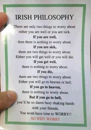 The Irish got it right! Yeah, why worry?! An Irishman’s Philosophy There are only two things to worry about: Either you are well or you are sick. If you are sick, Then there are only two things ...